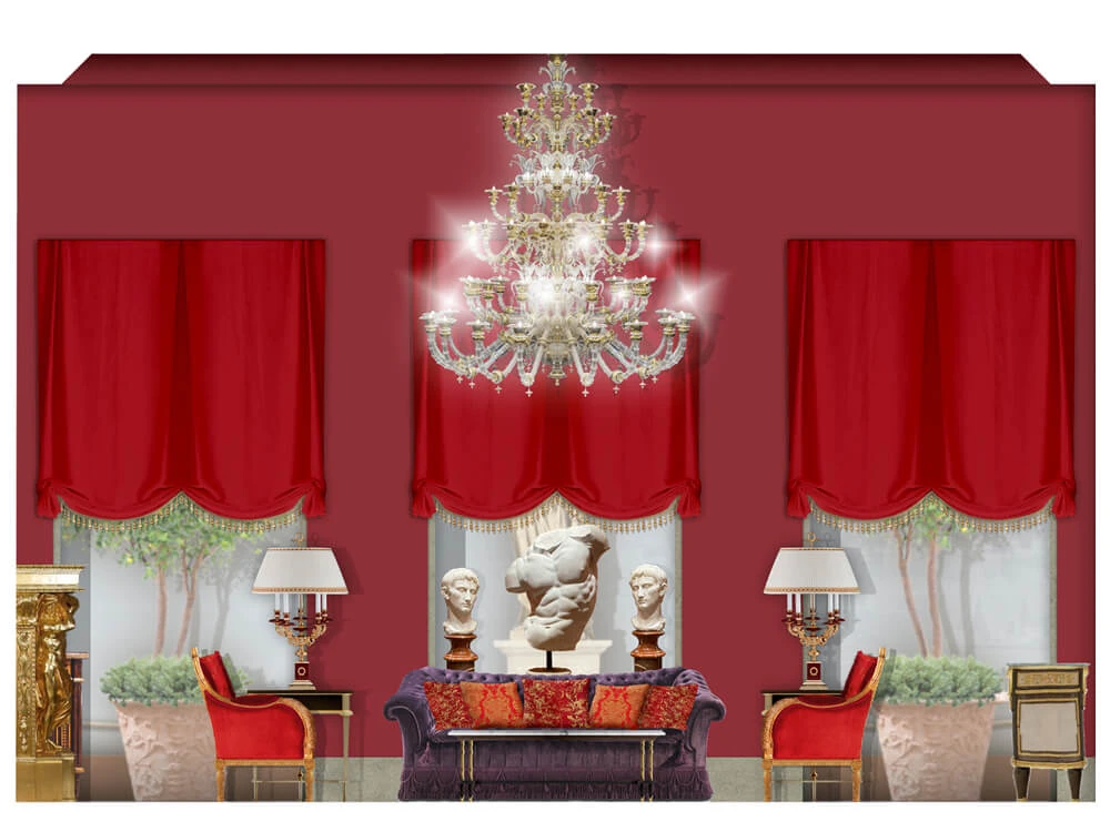 Nel Salone Rosso, l’architetto francese ha scelto il celebre chandelier Napoleon di iDOGI: un’opera iconica in vetro artistico con decorazioni in oro 24 carati, simbolo di magnificenza artigianale e bellezza senza tempo.