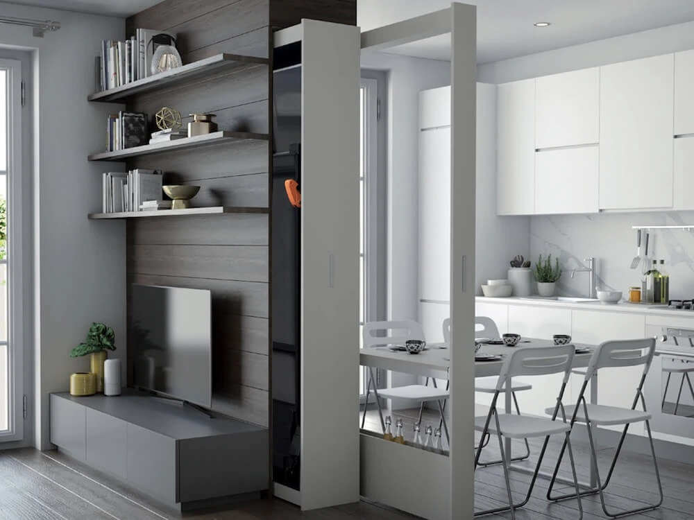Il modulo autoportante è personalizzabile, si installa rapidamente e non richiede concessione edilizia: il sistema di arredo a scomparsa Bigfoot® diventa così una soluzione smart per nuove costruzioni, ristrutturazioni o retrofit.
