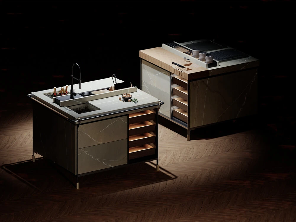 Elemento distintivo del sistema è l’impiego di cinque componenti in fusione con finitura ottone, progettati appositamente per questo modello. Questi elementi strutturali consentono assemblaggio, regolazione e stabilità autonoma della cucina, che viene completata da moduli in legno per offrire ulteriori possibilità di personalizzazione.