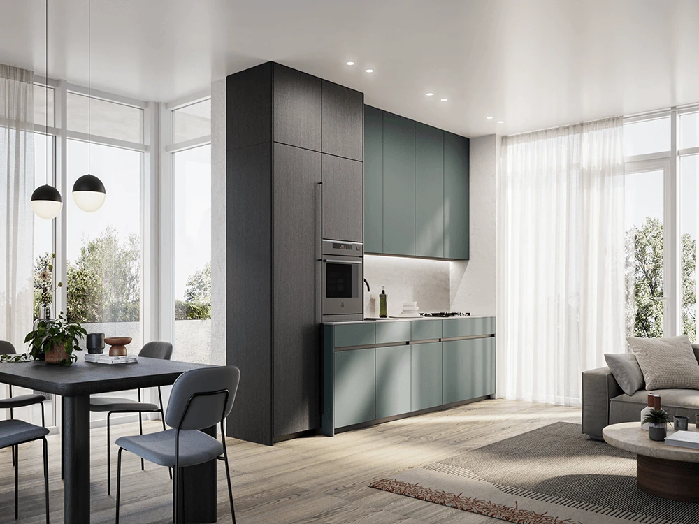 Nella composizione proposta, Arredo3 interpreta la cucina come un ambiente integrato con il living grazie al modello Time, una cucina lineare sviluppata in un unico blocco che sfrutta tutta l’altezza tramite colonne, sopra-colonne e pensili capienti.
