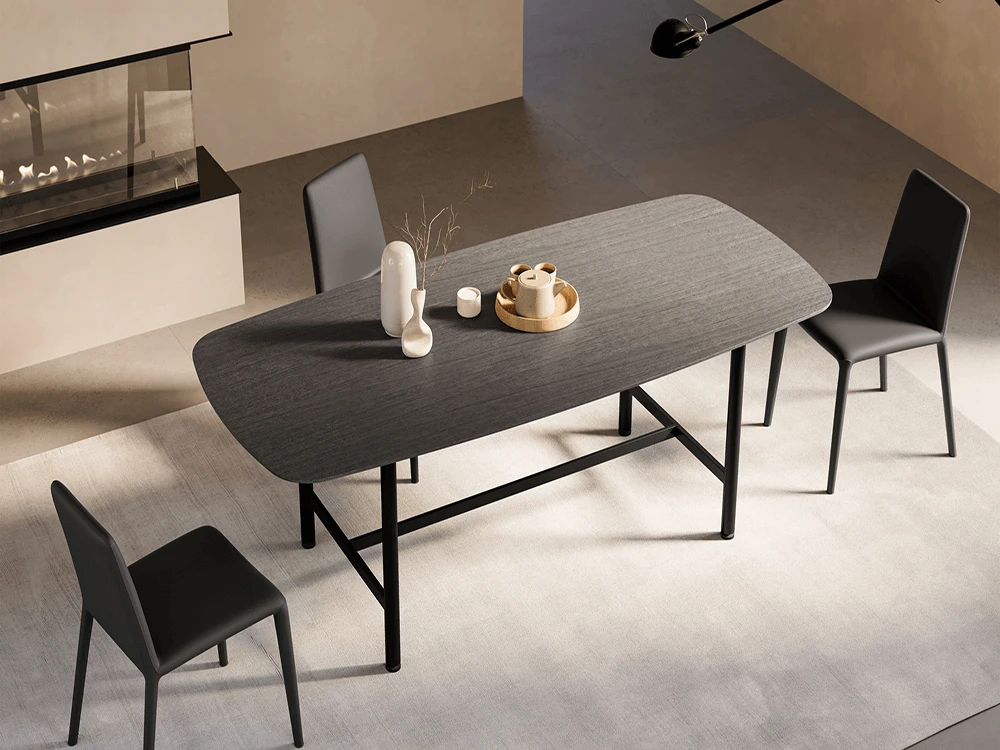 Il tavolo Arco, anch’esso in impiallacciato coke, presenta un piano rettangolare con angoli raggiati e gambe composte da parallelepipedi con teste stondate. Disponibile in due dimensioni — 100×180 cm o 100×240 cm — fa parte di una collezione esclusiva firmata Arredo3.