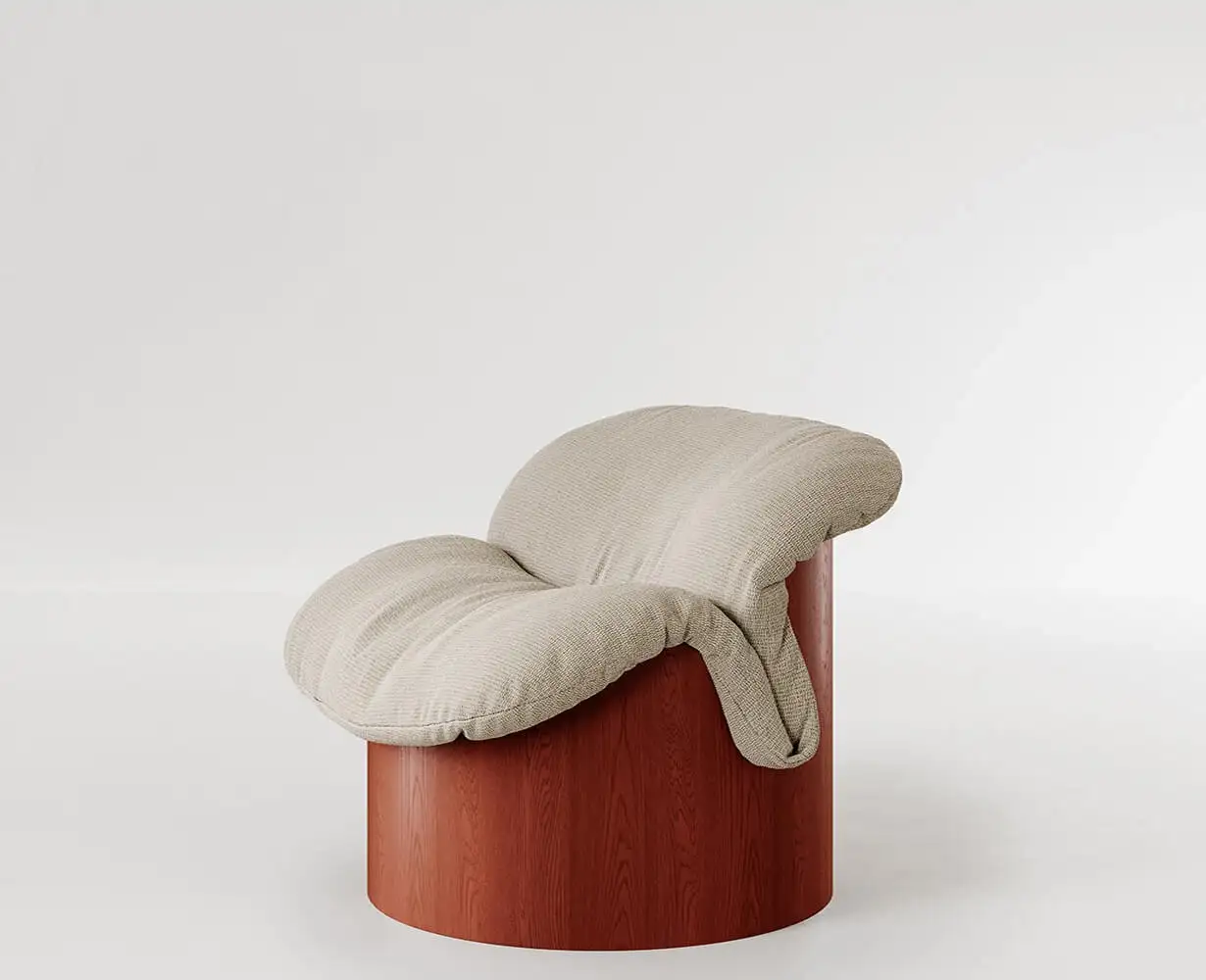 La poltrona LOBO si distingue per la sua silhouette essenziale, caratterizzata da una struttura cilindrica in multistrato di legno curvato e da un cuscino imbottito removibile che genera un volume morbido e accogliente.