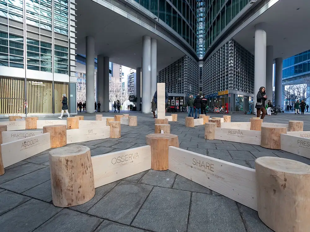 Al centro dell’installazione trova spazio uno speaker’s corner, pensato come luogo dedicato alla narrazione e allo scambio di idee, dove i visitatori possono approfondire il legame tra design, foreste e sostenibilità.