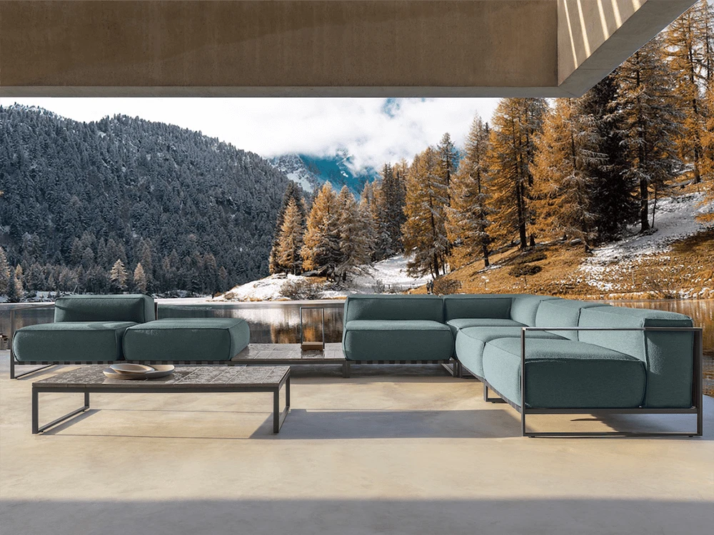 La collezione Casilda, disegnata da Ramón Esteve, torna con nuove finiture e cromie pensate per ambientazioni invernali. Il divano outdoor extra-soft si veste di ottanio e pietra lavica, enfatizzando il contrasto tra la struttura geometrica in acciaio e i cuscini morbidi di grandi dimensioni.