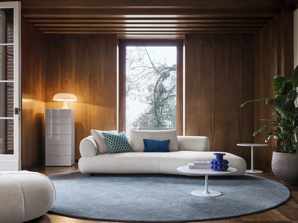Il concetto di total living prende forma con cuscini decorativi, tavolini da salotto e pouf coordinati. Accenti materici e volumetrie misurate completano i divani Twils, offrendo continuità visiva tra seduta e accessorio e rafforzando l’identità del living come spazio di relazione.